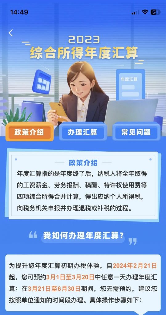 国家税务总局通知,2024年3月1日起,2023年度个税综合所得年度汇算开始,符合办理条件的纳税人可以预约办理啦!